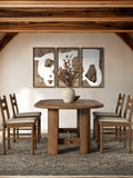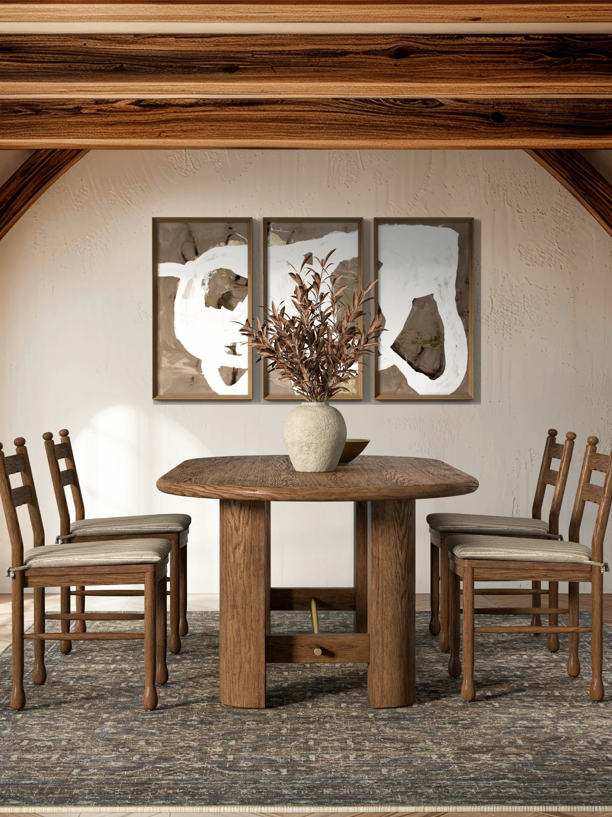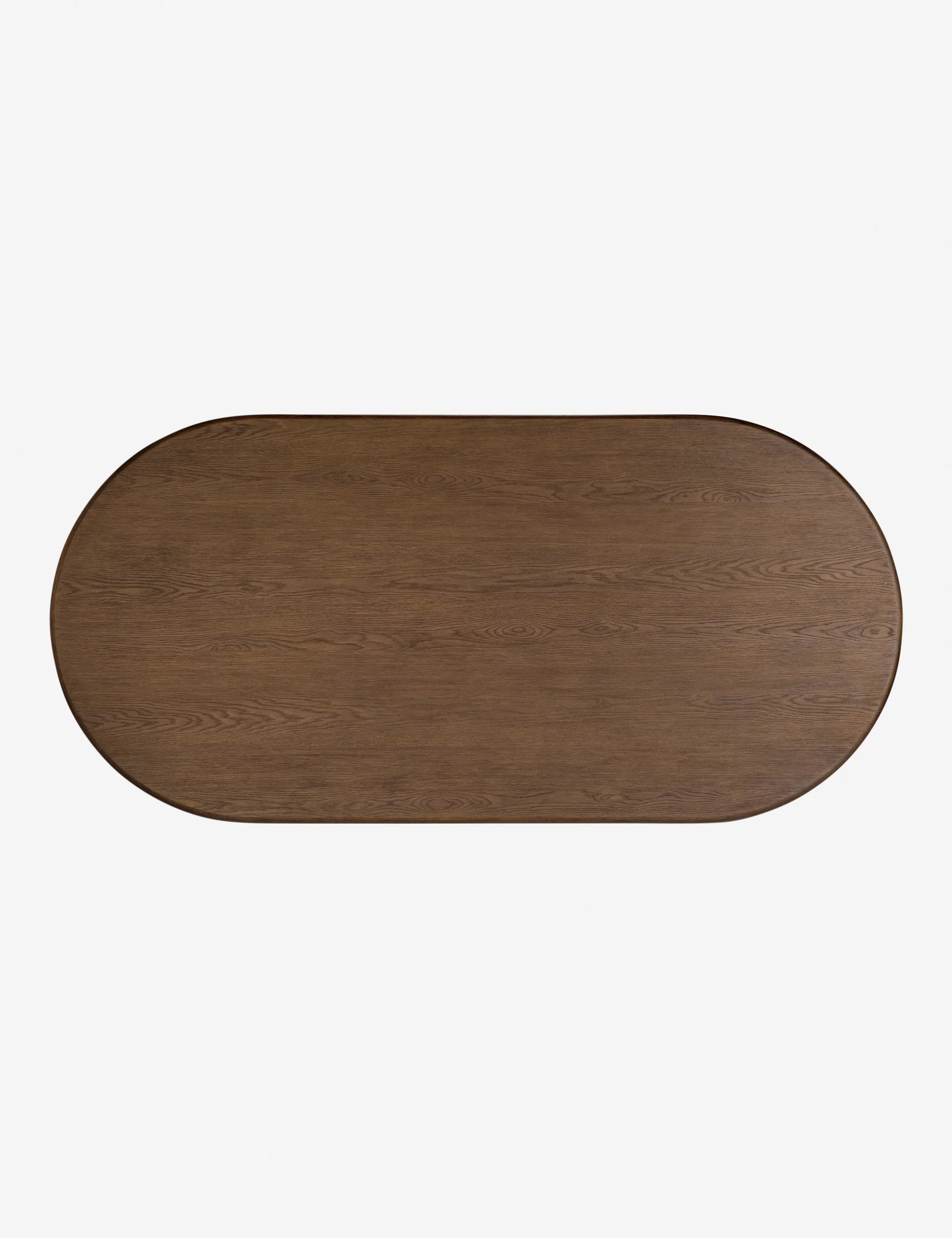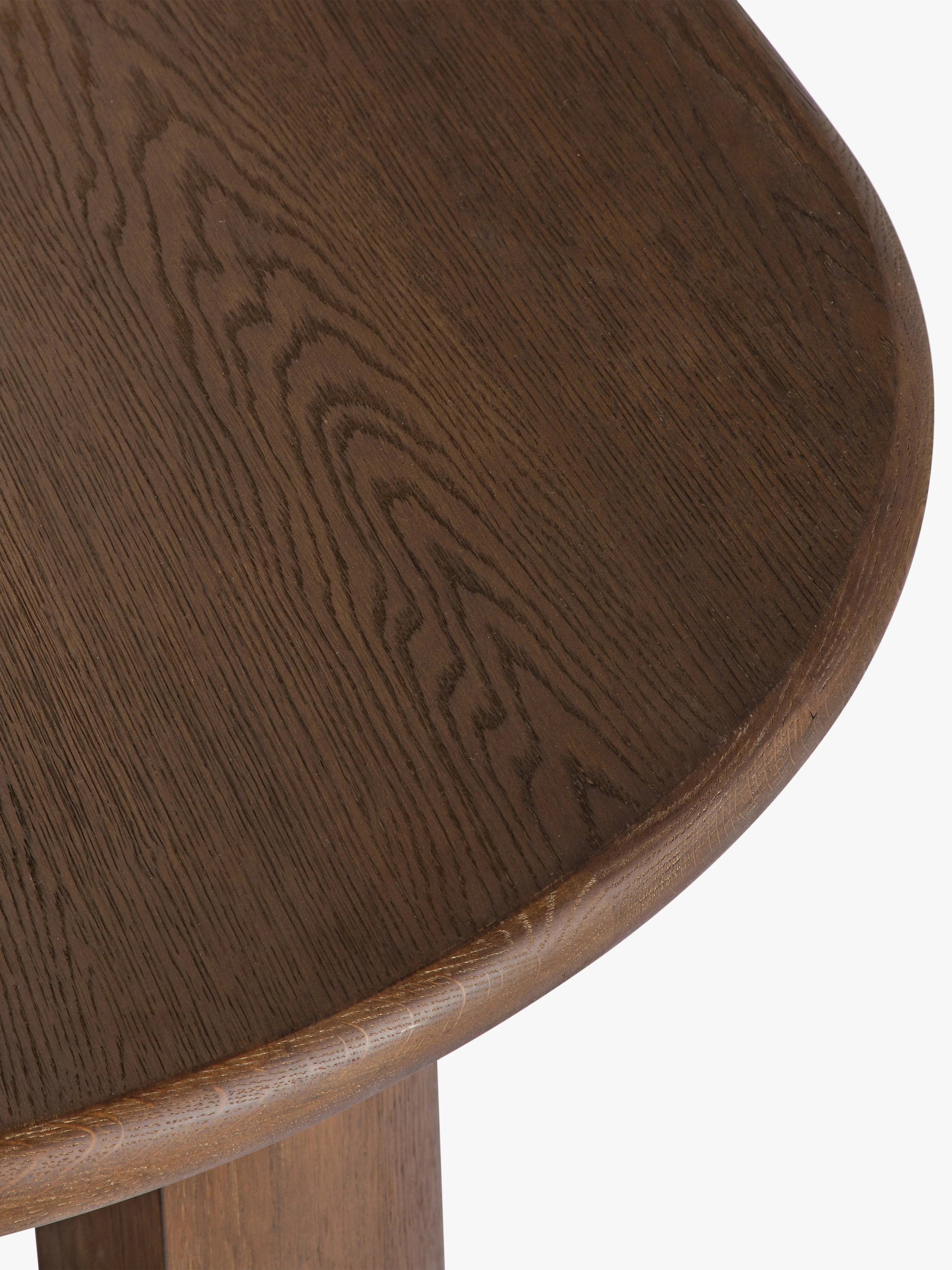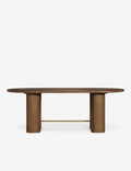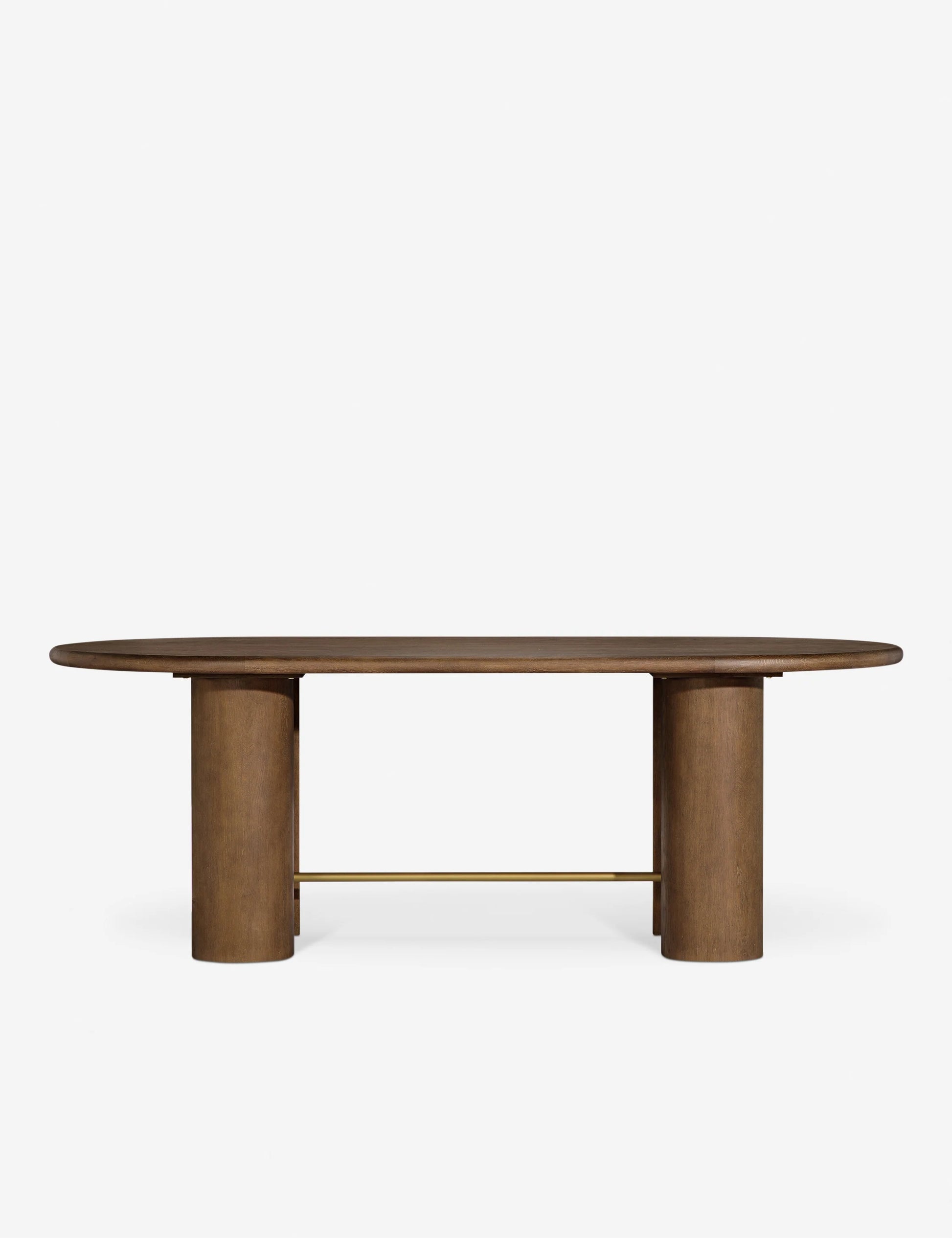 With its refined oval silhouette and sculptural half-column legs, this table brings both form and presence to the heart of your home. Crafted from solid oak, it features a rich dark finish that emphasizes natural grain and texture, while the slender brass stretcher adds a subtle metallic accent for elevated detail. Designed to fit seamlessly into everyday gatherings and elevated dinners alike, itβs a piece made to lastβand to be loved.