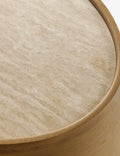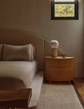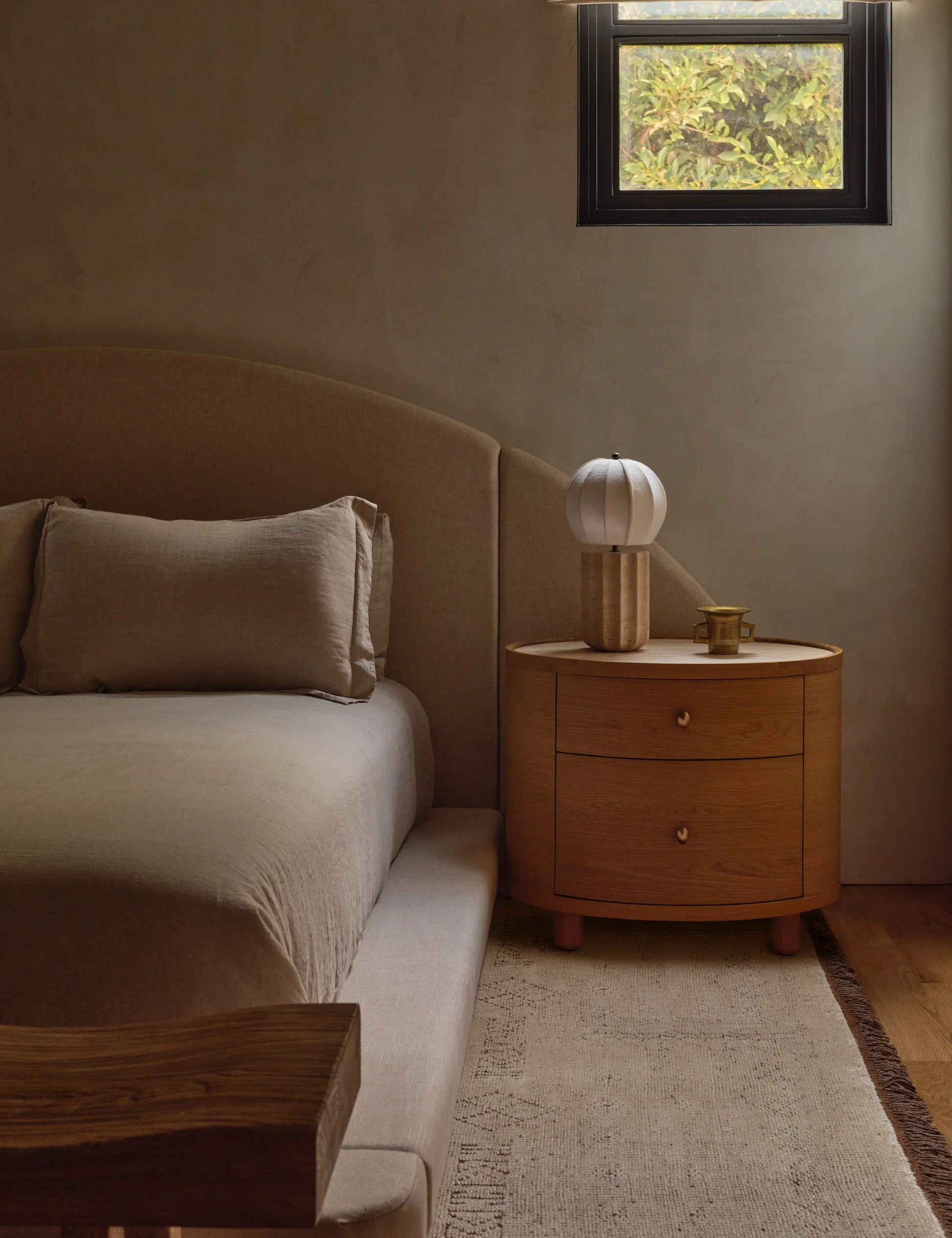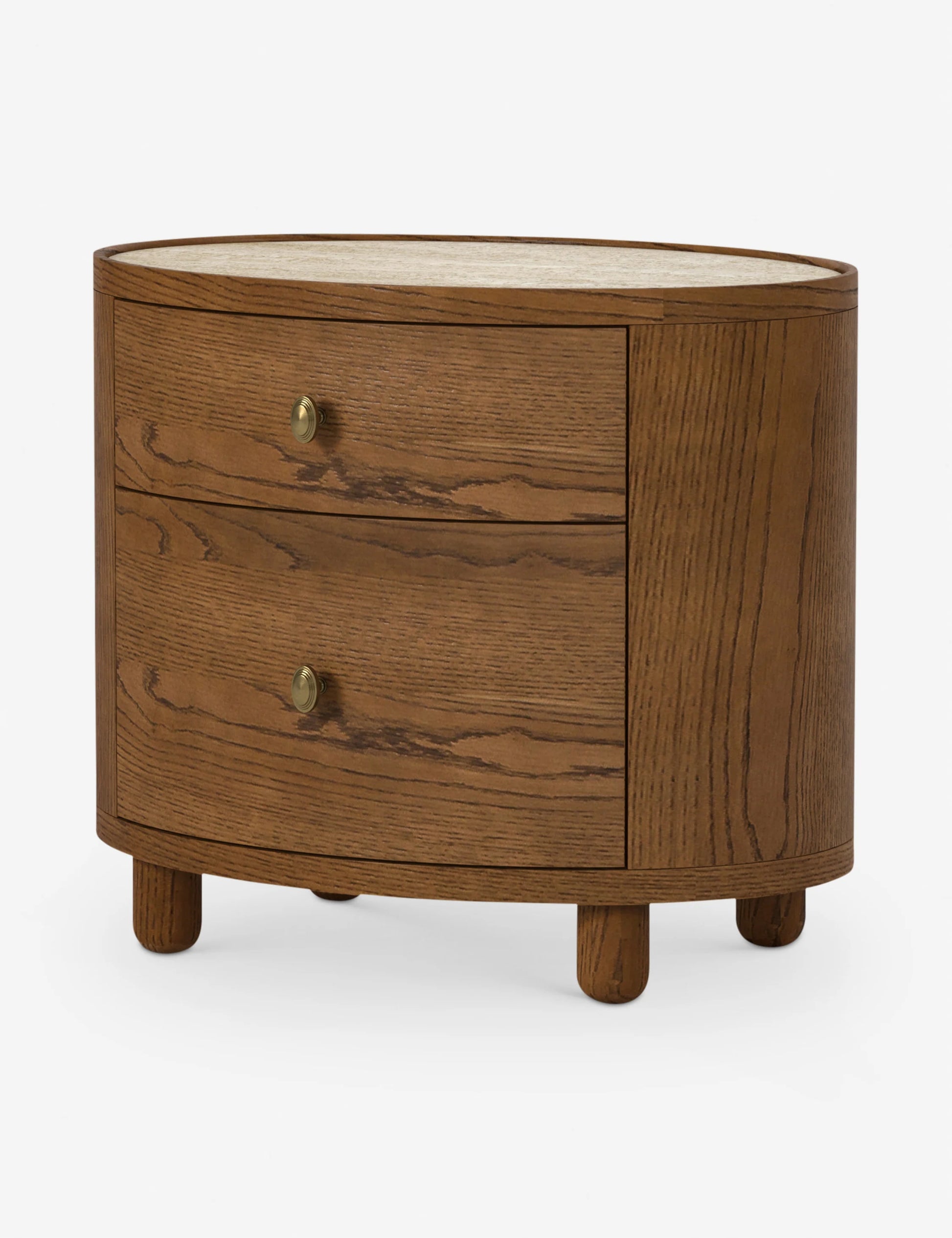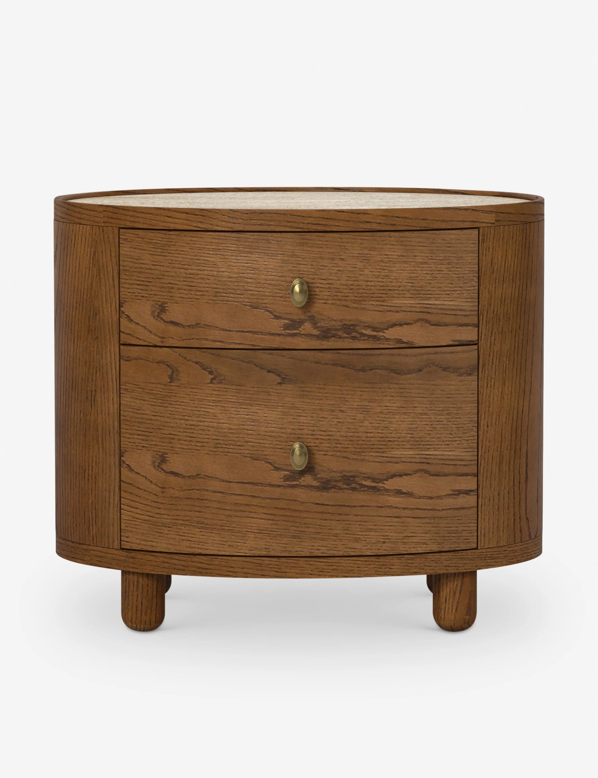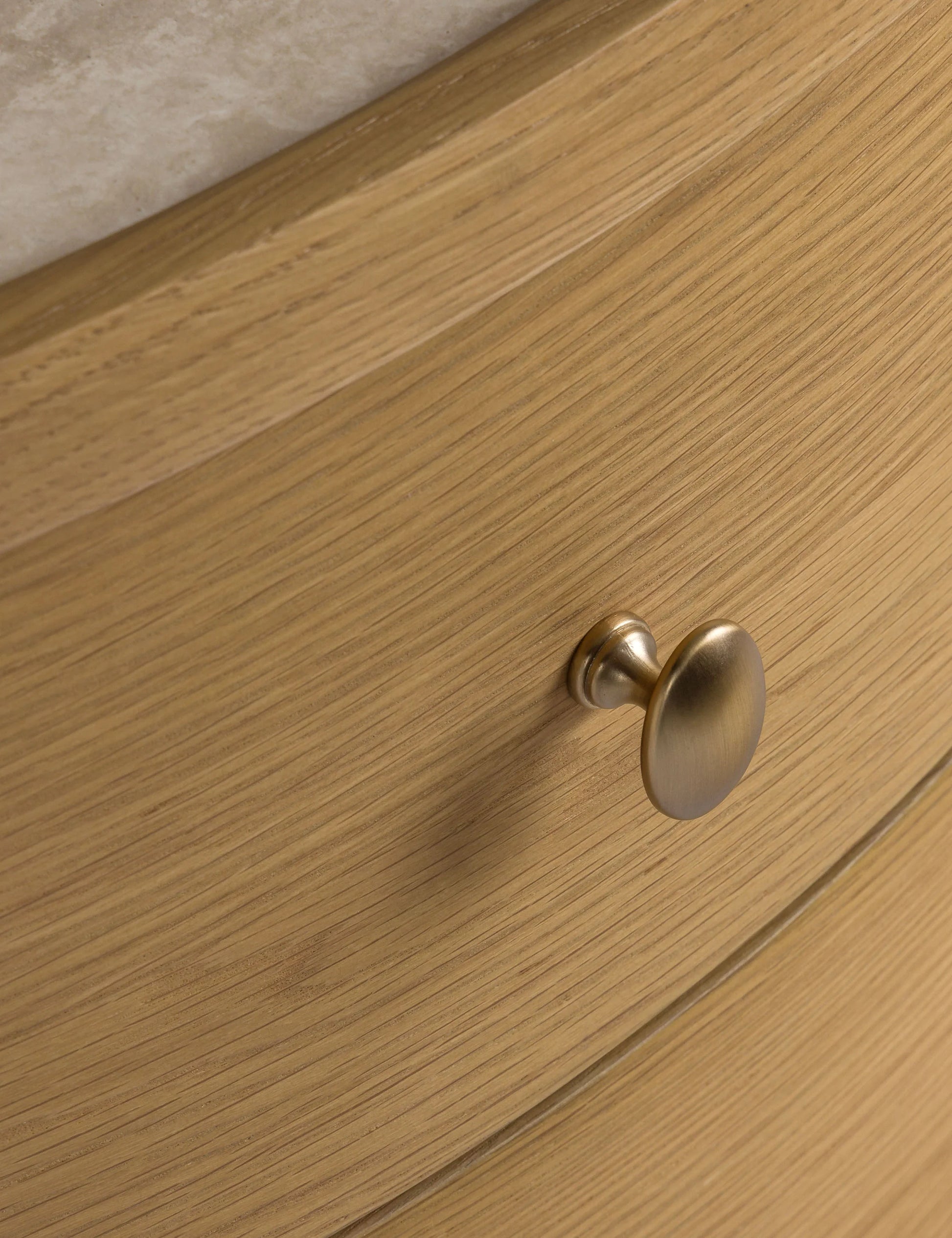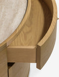 With its softly oval profile and elegant bun-feet base, the Laguna Side Table blends graceful form with everyday function. Finished in rich oak tones and accented by round pulls and soft-close drawers, it brings subtle sophistication and thoughtful craftsmanship to any room. Available in two color options to complement different styles, it anchors the space with quiet presence and refined detail.