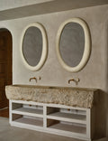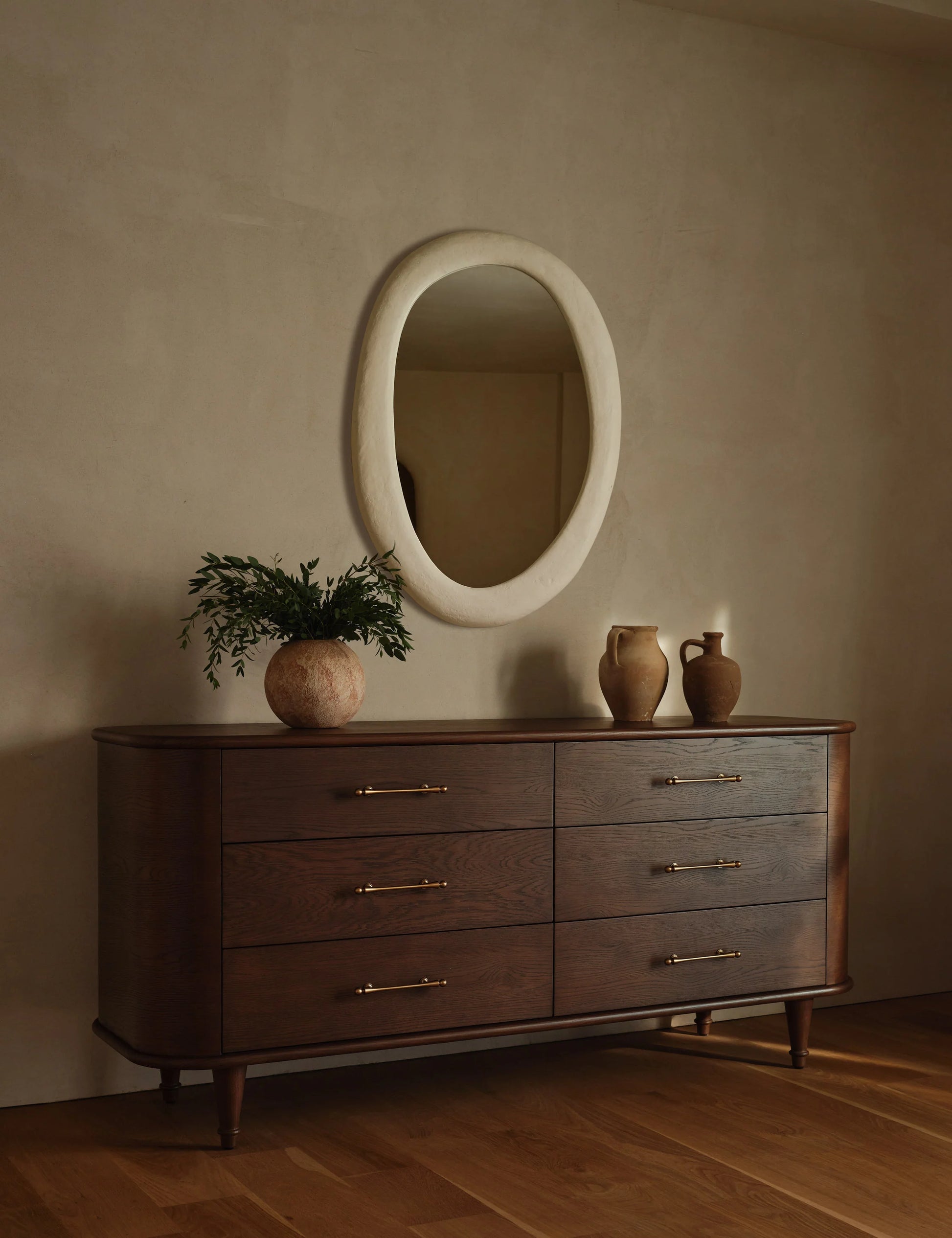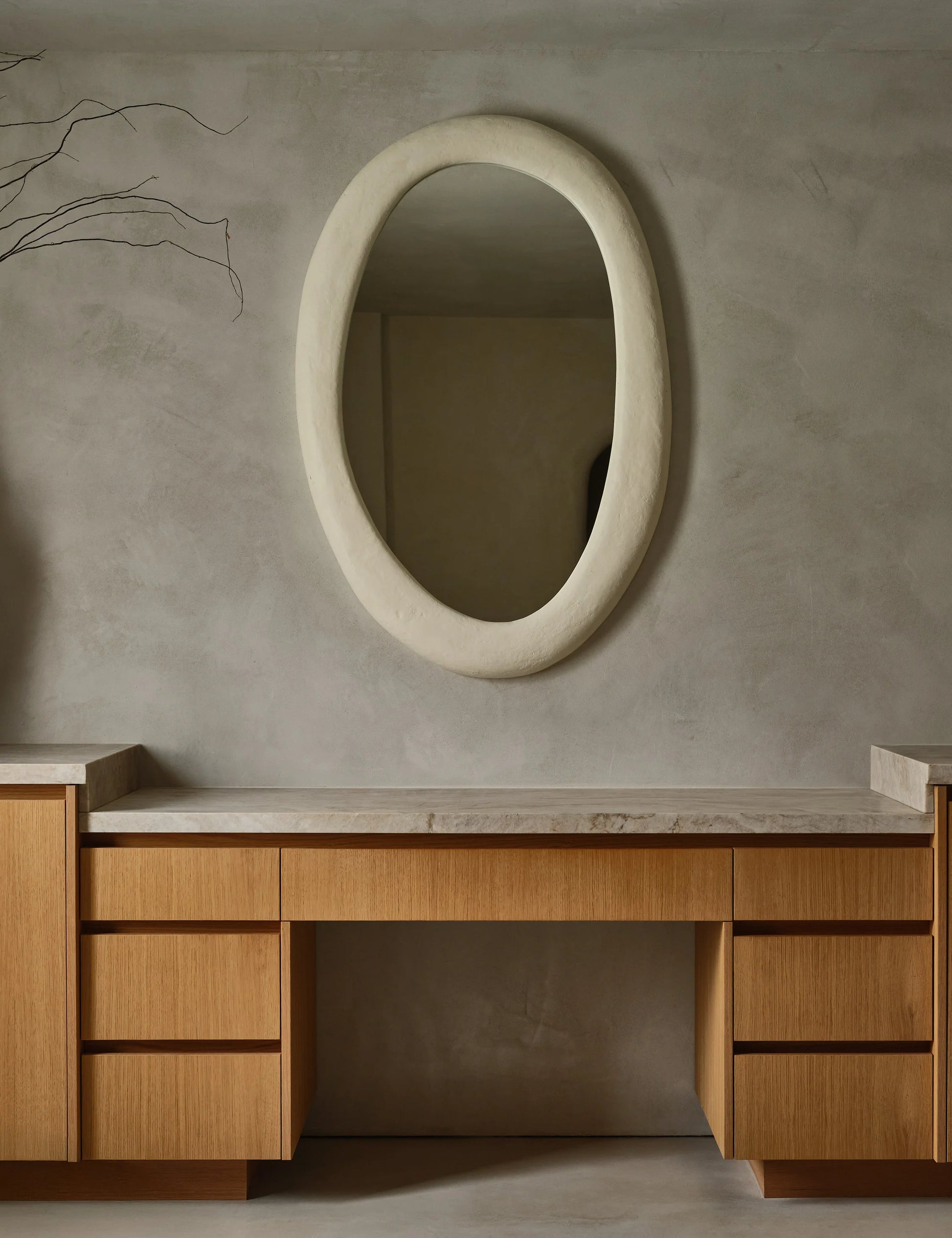 With its softly curved, oval profile and plaster-inspired finish, this mirror brings sculptural serenity to any space. The subtle texture and warm neutral tone give it depth and presence without dominating the room. Whether hung in an entryway, bedroom, or living area, it reflects light and opens the space while grounding it in refined craftsmanship. A perfect balance of artful detail and timeless utility.